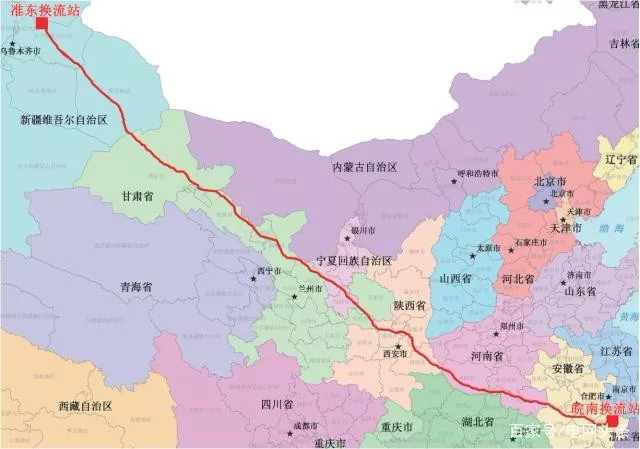 準東-皖南±1100千伏特高壓直流輸電工程起于新疆昌吉州昌吉換流站,止于安徽宣城市古泉換流站,途經新疆、甘肅、寧夏、陜西、河南、安徽六個省區(qū),送電距離3324公里,輸送容量1200萬千瓦,每年可向華東用電負荷中心輸送600-850億度電能,將有效緩解華東地區(qū)中長期電力供需矛盾,促進西部、北部能源基地開發(fā)與外送。