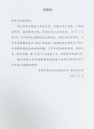 近日,操動機構(gòu)龍全生同志收到了來自天津市電力公司的感謝信,信中對西開電氣售后服務(wù)人員成方榮同志的溝通服務(wù)態(tài)度和操動機構(gòu)龍全生同志的敬業(yè)精神、技術(shù)水平表示滿意和稱贊!12月13日...